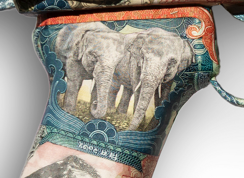 This extraordinary AK-47 is adorned with authentic Nepalese banknotes, each note depicting the country’s rich wildlife — celebrating the harmony between nature and humanity found in the Himalayas. Conceived following a monumental expedition to Mount Everest, the artwork reflects both the physical and spiritual journey undertaken by those who climbed to the world’s highest peak. It embodies the triumph of overcoming adversity through unity, resilience, and leadership.